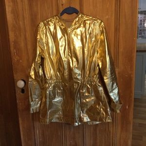 Manteau de pluie couleur Or. Designer Isaac Mizrahi New York. Comme neuf. Avec capuchon fermeture à glissière 2 poches frontales appliquées grandeur 12 ans mais fait petit. Aucun défaut