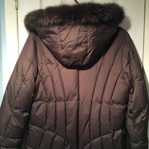 New coat which is lined with down. Brown fur collar that comes off at your choice. Pocket on the front.