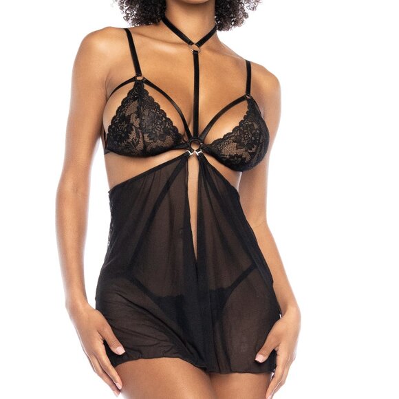 Lace teddy with a cutout cage design featuring criss-cross elastics over soft lace cups, adjustable straps, criss-cross underbust straps, an hook & eye back closure, an hook & eye crotch closure and a fully open back exposing the rear & Sheer mesh flyaway skirt with a hook at the top to attach/detach from the teddy.