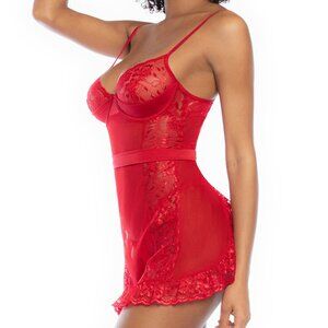 Sheer mesh apron babdyoll with a flyaway back, a thick tie-back waistband, a satin overlay on top of underwired lace cups, adjustable straps and an hook & eye back closure. (Matching heart ring G-string included)