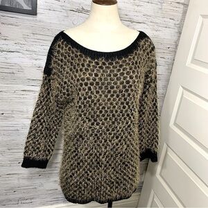 In very good condition, Soft Eye lashes "fuzzy" knit Sweater, boat neck style, stretchy and cozy top. Back slit. Color is black with a golden brown. Please see pictures