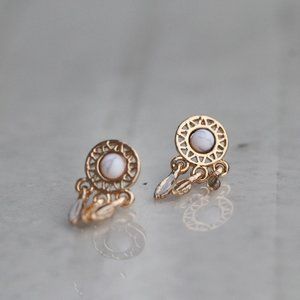 Embellished with white marbles, these adorable earrings are reminiscent of intricate vintage decorations. They could serve as a perfect addition to your everyday jewelry.
