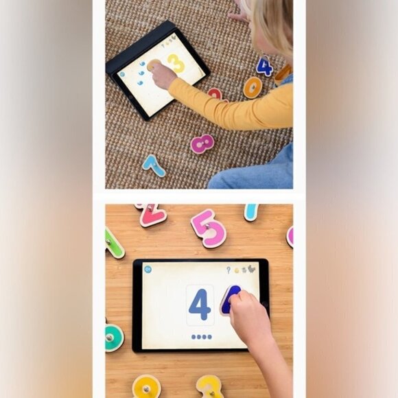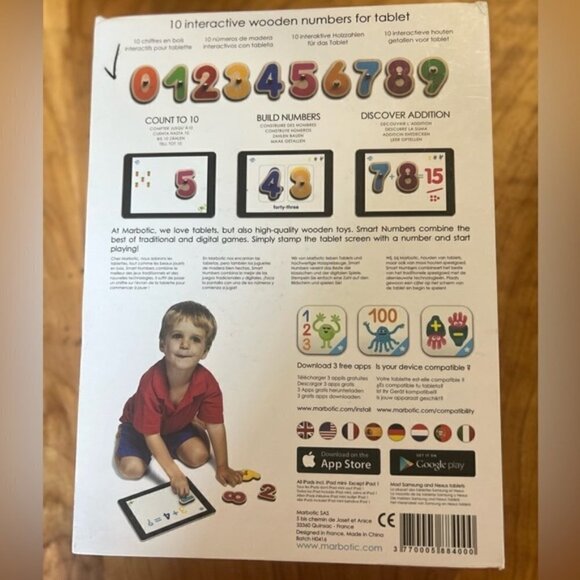 10 interactive wooden numbers for your child’s tablet— iPad. Some apps are available for free from the Apple Store. My family has outgrown this toy. Comes in original box. Educational interactive snd engaging toy to teach number sense using technology. Intended for ages 3+. A fun birthday or Christmas present for your little number-obsessed one. NO tablet or iPad included. Good for kids 3-8 years old, who are learning numbers 0-100.