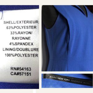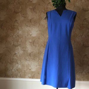 A casual sleeveless shift dress that can be layered over a button-down shirt for work. Designed by Marc Andrew for style and comfort with darts at the breast, a V neckline, two side pockets, and subtle front and back slits. The slight curves and darting in this dress emphasize an hourglass shape. Gorgeous royal blue color.