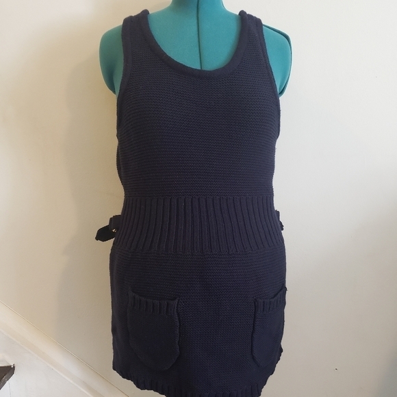 Navy blue sweater knit jumper mini dress with gold tone buckle at side.