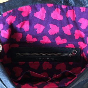 The interior pops with Marc Jacobs’ signature lining in a vibrant purple and hot pink abstract print—fun, bold, and unmistakably designer.