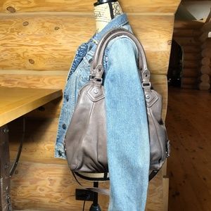 Fabulous bag! Dark taupe / Med brownish grey colour with silver hardware. Beautiful leather, goes with everything. Minor scratches on the front placket, plus some discolouration between the handles from use (not visible when wearing), also a tiny mark on the top handle. This bag still has some life left in it, not to mention amazing style. Comes with crossbody strap. This bag still looks amazing.