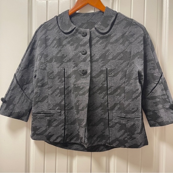 This Marc By Marc Jacobs houndstooth peacoat jacket is a chic and timeless piece. Featuring a black and dark grey houndstooth print, it is crafted from a 40% cotton and 60% polyester blend. The 3/4 sleeves and button-up design add a modern twist to this classic jacket, making it a versatile addition to your wardrobe.