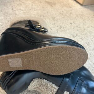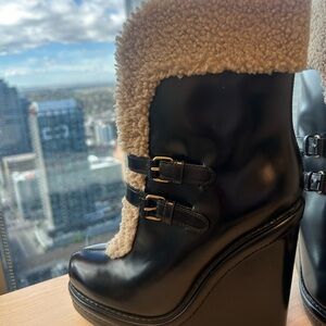 Marc By Marc Jacobs' 8.5 Shearling patent leather boots, showcasing a glossy black exterior paired with a plush cream shearling. These ankle-height boots are designed for both style and functionality, featuring decorative buckle hardware that adds a touch of sophistication. These are priced as they are technically out is season- these are 1200 dollar beauties! Classic, quite luxury and old money all wrapped into one!