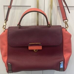 Marc by Marc Jacobs tri color leather sheltered island satchel with a flap with push lock closure and gold/ black toned logo/hardware, top handle, removable/adjustable long strap, fabric logo lined interior with smaller pockets inside. Good pre owned condition with a few signs of wear, a few small spots of wear to the leather, some wear to corners, some light wear/scuffs to hardware, push lock has tarnishing, one mark of discolouration/fading to the leather under the flap and one mark of discolouration on the leather on the left side of the bag. Please see photos, measurements are for reference only. Reasonable offers welcome!