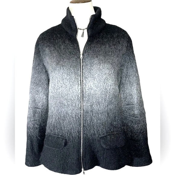 In very goodpre owned condition, Transitional fuzzy Jacket, soft and stretchy, excellent quality,( 58% Mohair, 32% Nylon, 10/ Virgin Wool) 2 front pockets, full zip.