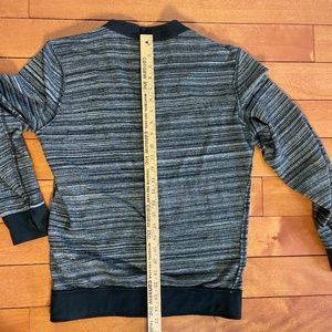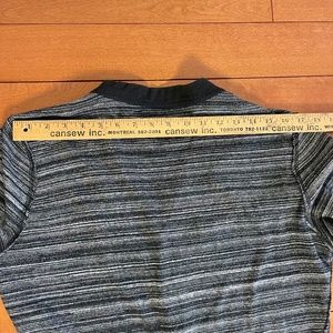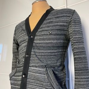 Black and Grey button up cardigan size Small. Thumb-hole design on left side only. Check out the black and silver enamel pin on front chest (metal scissors). Raw edge surge design on shoulders, arms and pockets. Black placket (down the front) finished with no raw edge....makes for a cleaner look. Soft, mid weight cotton (100%). Metal buttons with Marc Eckō scissor logo on each. Great look for casual but smart office work. Gender neutral.