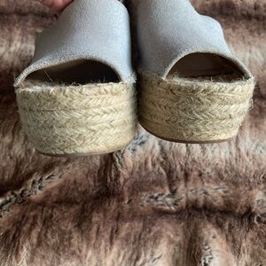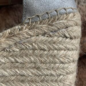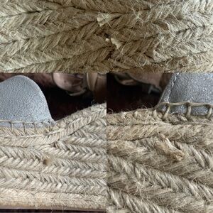 Colour is called silver leather, it has a shimmer to it. Shoes are new without box. Minor wear to soles from in-store try-ons. Some short pieces of woven espadrille have come loose. Glue residue visible along wedge. Leather has some indents when not being worn. Few light markings and scuffs, mainly out of glazed edges.