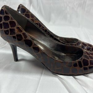 Elevate your style with these Marc Fisher heels, featuring a striking giraffe print in rich brown tones. Crafted from a glossy material, these pumps boast a classic pointed toe and a high, slender heel for a sophisticated look. Perfect for adding a touch of elegance to any ensemble.