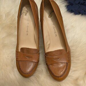 Marc Fisher Tan Leather Platform Heel Penny Loafers