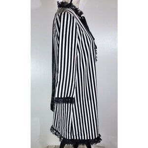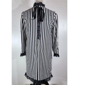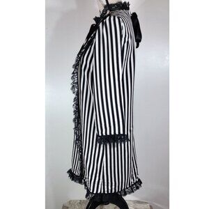 Make a bold fashion statement with this unique and elegant Marc Jacobs dress. Featuring a classic black and white vertical stripe pattern, this dress is elevated by exquisite black lace trim on the cuffs and hem, and a charming black bow tie at the neck. The high collar and button detailing on the shoulder add to its distinctive, sophisticated aesthetic.