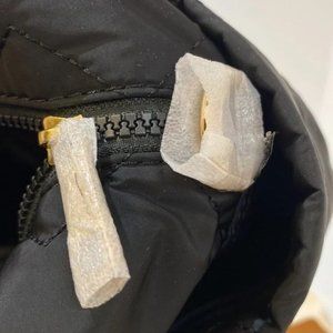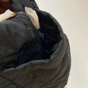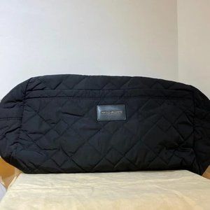 This Marc Jacobs large quilted nylon duffle bag in black features a top zip closure, a front slip pocket, and an interior zip pocket. Can be worn by the shoulder straps or crossbody webbing strap.