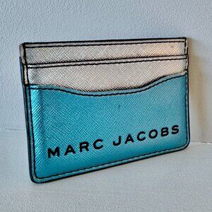 Authentic Marc Jacobs blue and silver card case/wallet, metallic leather with logo on front. Has some marks on front as shown and scuffs/missing some trim on side tops. In excellent functional condition, good aesthetic condition. Cat friendly, nonsmoking home.