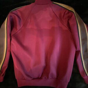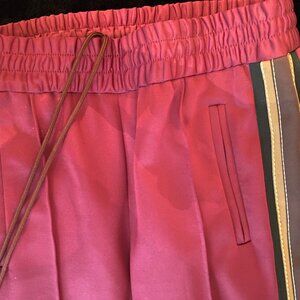 Burgundy top and pant with beige, brown, black detailing. Not suitable for jogging, too structured material and fit. Might be best worn with a T-shirt and bicycle short under layer as there is no lining in the design.