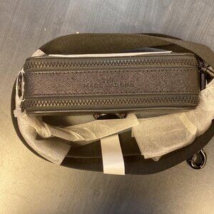 This Marc Jacobs snapshot camera bag in black leather features a rectangular body, an all around zip fastening, a front logo plaque, an embossed logo, a full lining, an internal slip pocket, an internal logo stamp and a detachable and adjustable shoulder strap.