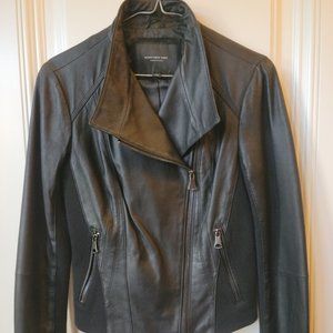 Marc New York, Andrew Marc, EUC, Size S, black leather moto jacket, with 2 zip pockets, front assymetrical zip closure, ribbed knit sides and along underside of sleeve, great for stretch!! Slight scalloped hemline per pic. No visible marks, stains or tears. In almost new condition!! Great staple that can be worn with everything!!