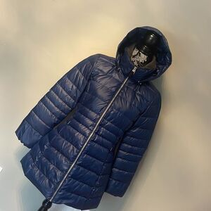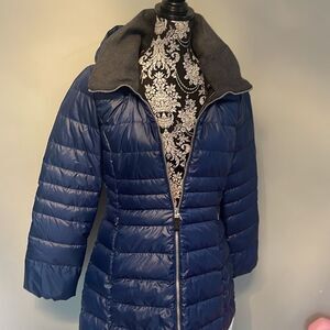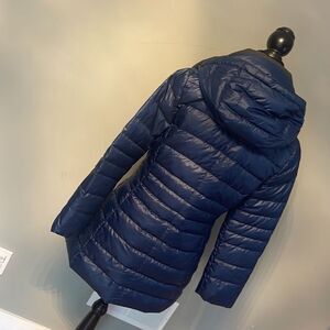 Lightweight, weatherproof jacket with insulated warmth; Zip-off hood; Stand collar; Knit inner collar; Long sleeves; Zip front; Concealed waist zip pockets; Fully lined and filled; About 30" from shoulder to hem; Shell/lining: polyester; Fill: 90% down/10% waterfowl feathers; Machine wash