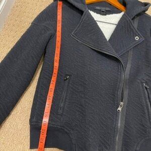 Cozy meets chic in this black quilted jacket from Marc by Marc Jacobs. The Cleo jacket features a soft fleece lining, asymmetrical zip front, and snap-button collar closure. With ribbed cuffs, zippered front pockets, and a hooded design with a zip-around detail, it’s perfect for layering in cool weather. The deep charcoal black color adds a sleek and modern edge to this warm and functional piece.