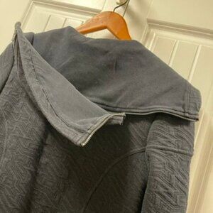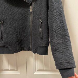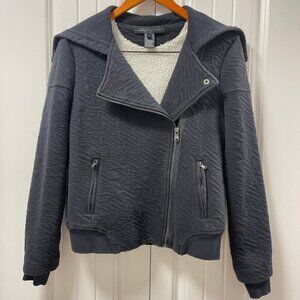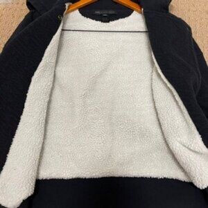Cozy meets chic in this black quilted jacket from Marc by Marc Jacobs. The Cleo jacket features a soft fleece lining, asymmetrical zip front, and snap-button collar closure. With ribbed cuffs, zippered front pockets, and a hooded design with a zip-around detail, it’s perfect for layering in cool weather. The deep charcoal black color adds a sleek and modern edge to this warm and functional piece.