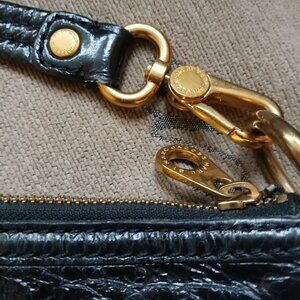 In gorgeous dark navy blue patent shiny leather with gold hardware lined with signature Marc Jacob's allover print interior.