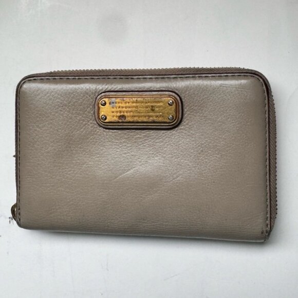 Marc by Marc Jacobs Leather Compact Wallet Zippy Wristlet Bag Beige Gray Wine Pockets