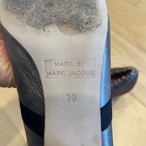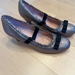Marc by Marc Jacobs metallic leather kitten heels. Dark metallic silver leather colour with black ribbon accents. In good used condition. Size 39. Heel height is about 2”.