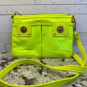 Pop of color with this bright snake-embossed leather crossbody handbag with 2 outer pockets, 1 small inner pocket.