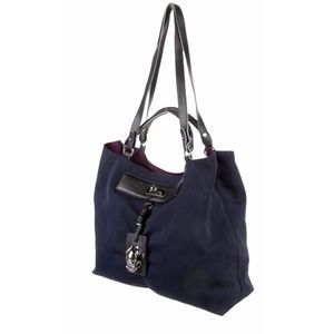 Excellent condition blue nylon tote with black leather trim. Silver tone hardware. Rolled handles and dual shoulder straps. Purple nylon lining and dual interior pockets. Metallic snap closure. Gorgeous bag. 19” X 13.5” X 6”. Handle drop 3”, shoulder strap 12.5” Made in Hungary, PF08. Some pics are lightened to show details.