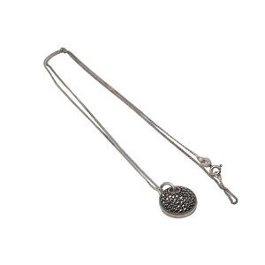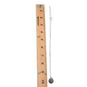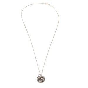 Round Marcasite pendant in sterling silver setting, marked 925 on back. The delicate sterling silver box chain also reads 925 Italy. Could be vintage, not 100% sure. Comes with the pink box seen in pictures.