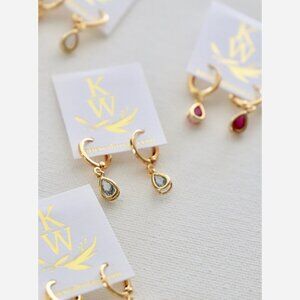-Materials: Gold plated huggie hoops with petite teardrop charm