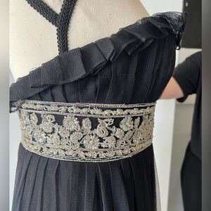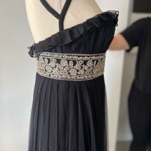 This Marchesa gown is a real show stopper!! Gorgeous gown with tule overlay. Beautiful ruffle details on the bust with a stunning silver beaded detailing. It fits like a dream.