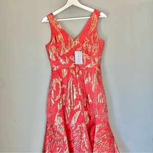 Gorgeous Marchesa Notte strapless ruffle-hem v-neck cocktail dress. New with tags. Deep coral colour with shimmery rose gold abstract pattern design. Cascading side ruffle and layered ruffles at hem. Flared silhouette. Hits approx. just above the knee. Back zip with hook & eye closure. 45% Polyester. 30% Nylon. 25% Metallic Fibre. A stunning dress for any spring or summer event!