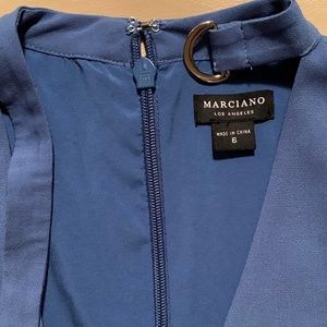 Stylish blue romper. Features cutout sleeves. V-neck with choker detail. Perfect for a chic look.