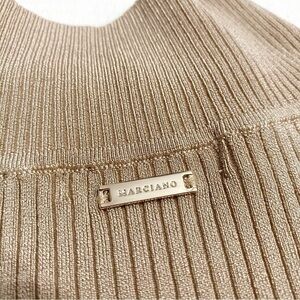 MARCIANO CAMEL TAN RIBBED STRETCH MOCK NECK SLEEVELESS BODYCON DRESS, a trendy neutral camel / tan / brown ribbed bodycon midi dress - sleeveless - mock neck - super stretchy and comfy yet fitted and sexy - unlined - pull over style - has a Marciano gold engraved tag in the upper back, Pencil dress - perfect for a first date, night out, holiday's trip / vacation special night out with pumps, peep toe or lace up sandals. Feminine and modern - go to dress - must have.