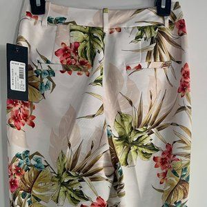 Featuring an eye-catching tropical print, this satin pant features a high-waisted fit, side slip pockets and cropped ankle. Concealed front zipper closure with hook-and-eye belt security.