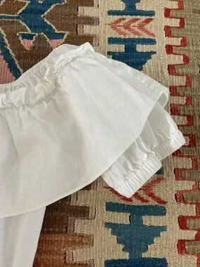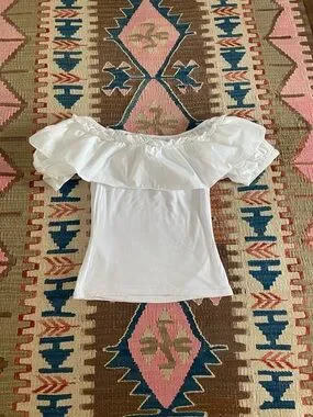 Elegant off-shoulder tee with a wide ruffle neckline. Rayon/viscose/spandex body with 100% cotton ruffle and sleeves. Offers a fitted silhouette. Romantic vibe.
