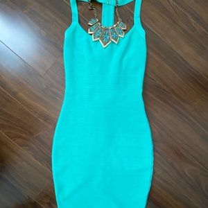 A beautiful bandage dress in a vibrant colour. Features notice-me cutouts at the back and zip closure.