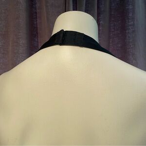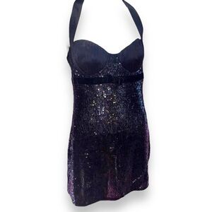 Halter top style sparkly sequinned black mini dress. Sweetheart bust and open back. The halter has an adjustable closure. Black velvet bow detail