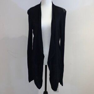 This pre-owned Marciano wrap jacket is perfect for any party or cocktail event. The short, draped front and solid black color create a modern and sophisticated look. The jacket is made from a lightweight rayon fabric blend and has long sleeves with an open front closure.