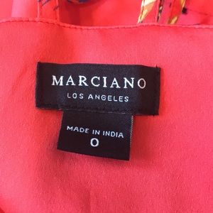 Breezy free flow printed maxi by Marciano. Elegant plunged neck with built in wiring to keep the girls in place. Open front slit, side zip and adjustable straps for the perfect fit. Comes with additional fabric that can be used for a hair tie, belt or scarf. 100% polyester. Size 0 very slight snag at bottom on back of dress as per last photo. Difficult to see. In overall very good condition