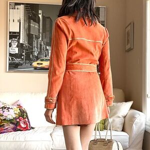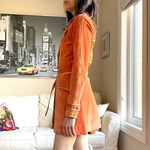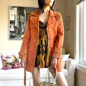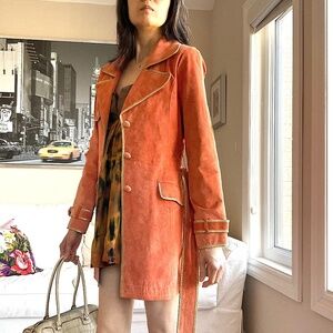 Fully lined with logo. Fitted. Button front closure with suede covered buttons. Belt loops. Matching hand tie belt. Collar. Loops at cuffs with decorative cuff belt. Hand pockets with flap. There are light dirt marks/stains throughout jacket(see pics for some examples. ) Still projects great style. Previous owner had used double sided tape to stick down lapel(see pic). Lining:100%polyester. Size Small(see measurements). Model is size small, 5’9. Approx 31.5in length, 16in shoulder seam to seam, 24in shoulder seam to cuff, 18in pit to pit, 15.25in width at waist, 19.5in width at hip area.