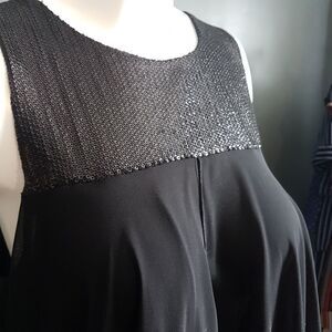 Whimsical black, sparkly guess by Marciano party dress. Ruffled tiered hemline. Very flowy and glamorous. Worn only once. Sleeveless with round neckline. Sequins above bust. Button fastening at back. Perfect LBD!