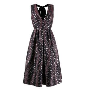 Black silk blend fern printed dress from Marco De Vincenzo featuring a deep V neck, a velvet bow back fastening, a sleeveless design, a fitted pleated waist, and mid-length.