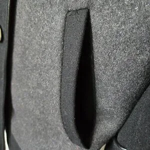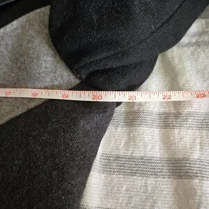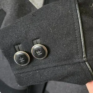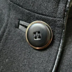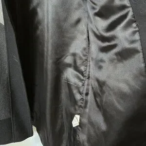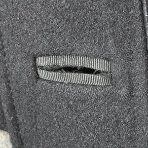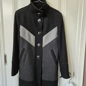 Marcona, EUC, Size M, Colour Blocked Wool Blend Coat. Grosgrain trimmed buttonhole openings, faux leather thin trim with some minor wear, pockets, button detail on cuffs.
