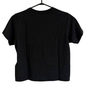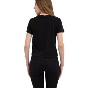 Styling: Paired with a black satin or leather-look skirt and a belt with a visible label
